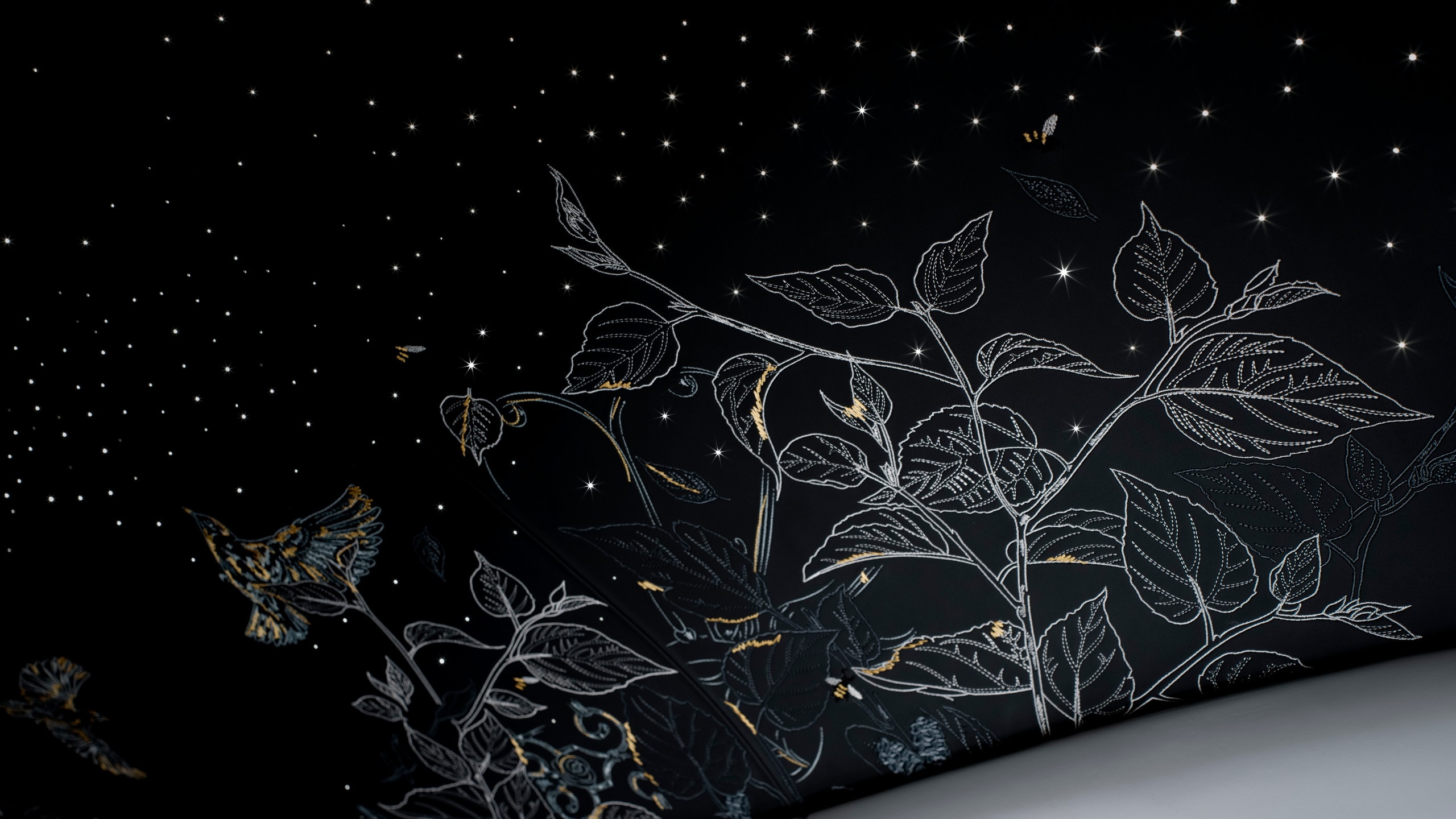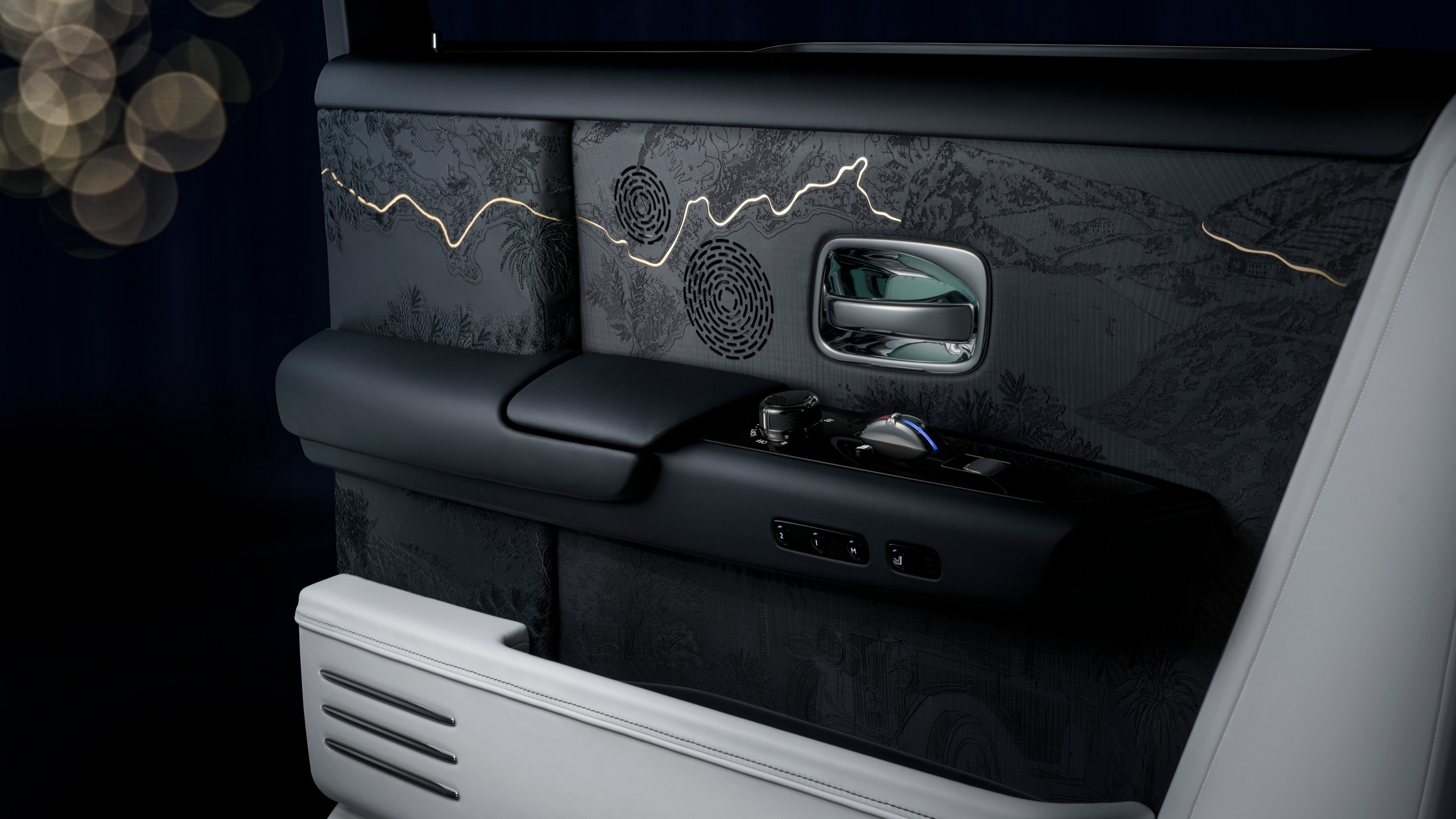 Задние кресла обиты тканью с многослойным узором, нанесенным и посредством вышивки, и при помощи специальной техники печати. В рисунке использовались образы географических мест, имеющих связь с прошлым Фантома, а также раритетных машин и самых известных хозяев. Авторы назвали ткань новой вариацией гобелена ручной работы. Исторические намеки есть также в «звездном небе» на потолке и на дверных картах, которые украшает деревянный декор со сложной тематической гравировкой.