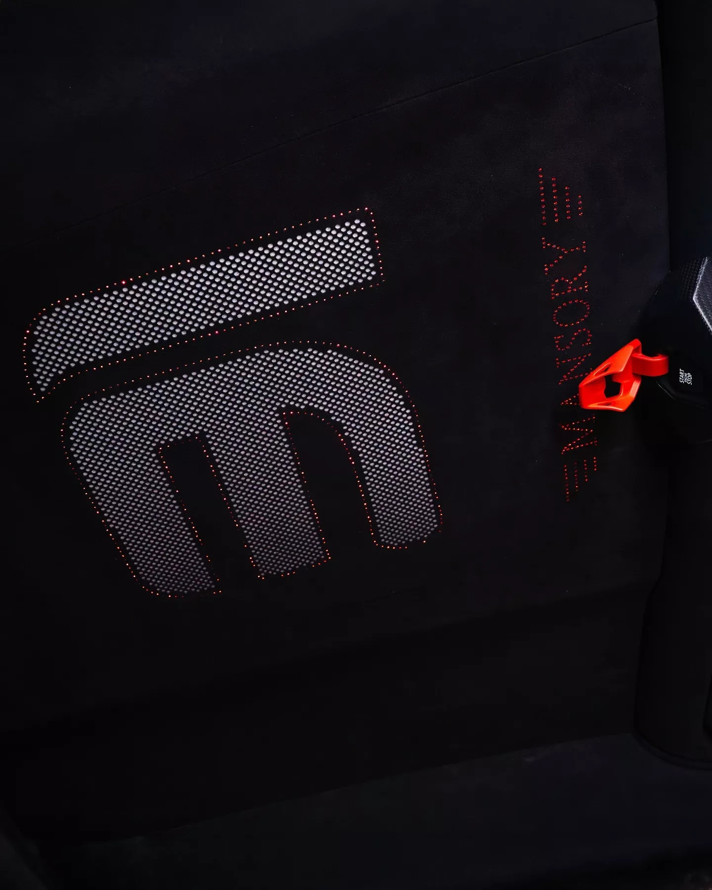 Интерьер оформили чёрной и ярко-красной кожей, расположившейся на креслах, передней панели и тоннеле трансмиссии. Помимо традиционной вышивки в виде логотипов ателье, дизайнеры нанесли повсюду эмблему самого Эстебана Окона. Кнопку запуска двигателя перенесли с консоли на потолок, а ремни безопасности выкрасили в красный цвет.