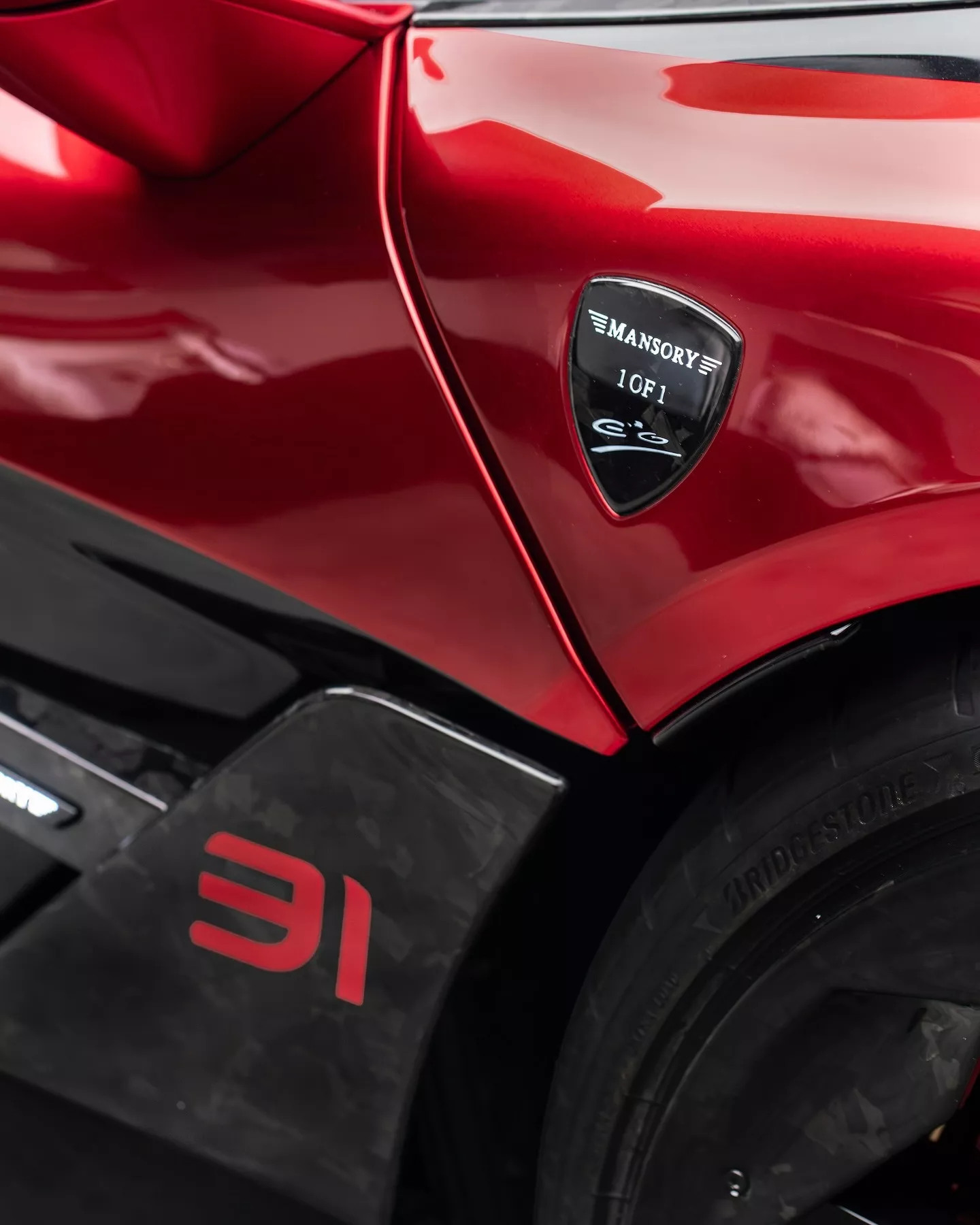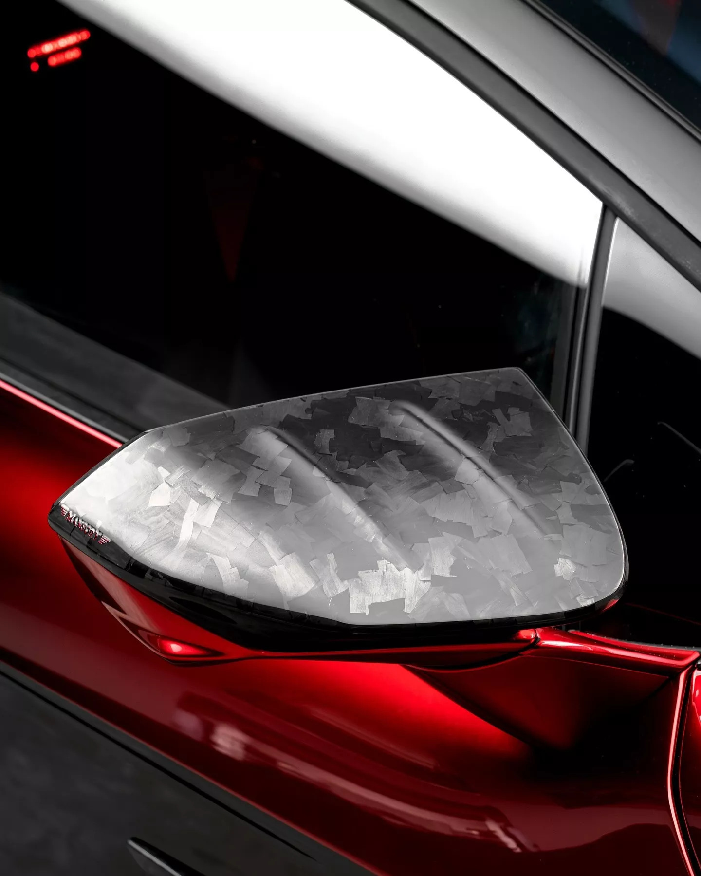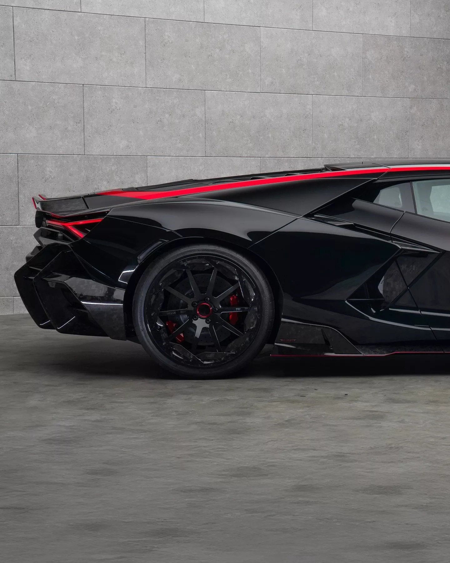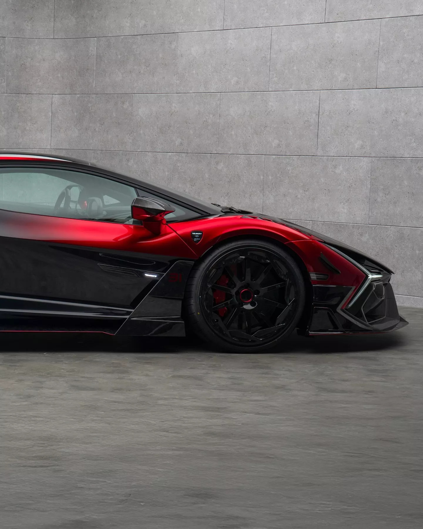 Автомобиль по сути заново облицевали кузовными панелями из углепластика, заодно сделав внешность агрессивнее и геометричнее. Капоту достался массивный воздухозаборник, бокам – низко посаженные «юбки», а корме – диффузор с гигантскими ламелями ломаной формы и высоко расположенные патрубки выхлопа. Местами дизайнеры использовали кованый карбон, а местами – обычный с чёрной глянцевой отделкой и градиентным тонированием при помощи красного колера. Получилось свежо, необычно и стильно.