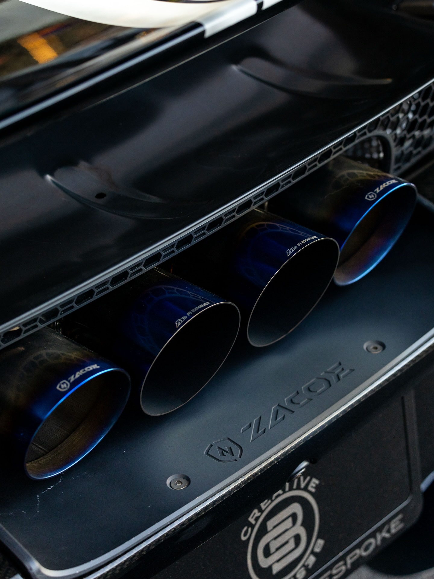 В ход пустили обвес от тайваньского производителя Zacoe. Расширенные арки, удлинённые боковые «юбки», накладки на оба бампера и капот, а также антикрыло с диффузором на корму кардинально преобразили внешность «британца», сделав его похожим на чисто гоночный болид. Дополнили образ алюминиевые «катки» в широких шинах и высокопроизводительная выхлопная система с четырьмя массивными патрубками по центру.