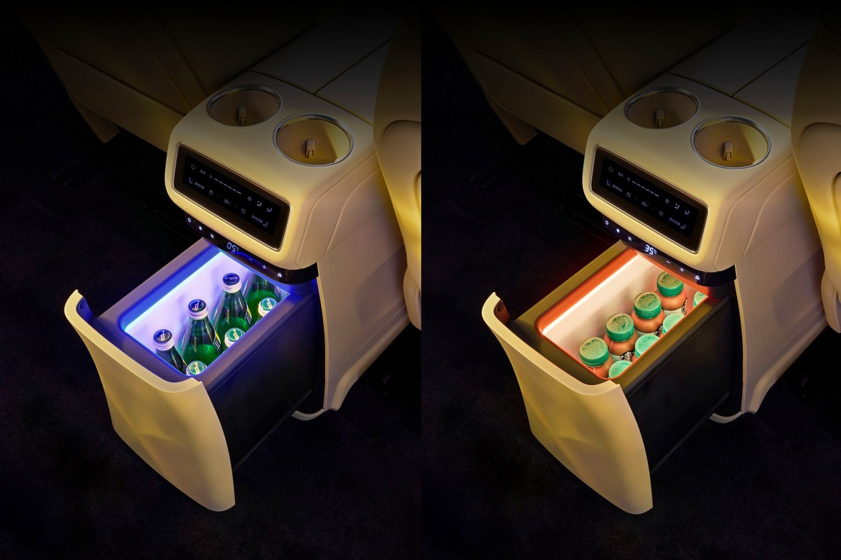Интерьер по умолчанию шестиместный, и уже в «базе» все сиденья обретут подогрев, а в топовых комплектациях первый и второй ряды обзаведутся вентиляцией вкупе с функцией массажа. Доступны два вида наборов водительских помощников и холодильник на 9,3 л (опция).