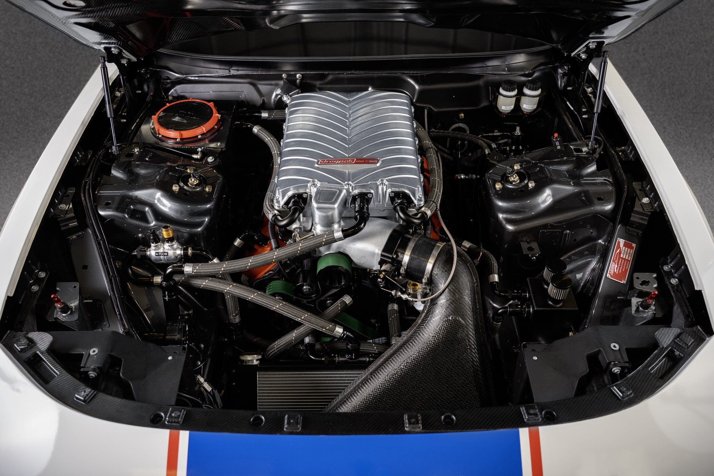 Dodge показал долгожданный Charger с мотором V8, отсутствовавшим у масл-кара со времен предыдущего поколения. Модификация с длинным именем Hustle Stuff Drag Pak обрела двигатель объемом 5,8 л с нагнетателем, кузовные панели из карбона и тормозной парашют. Соберут только 50 штук, и они не допущены на дороги общего пользования.
