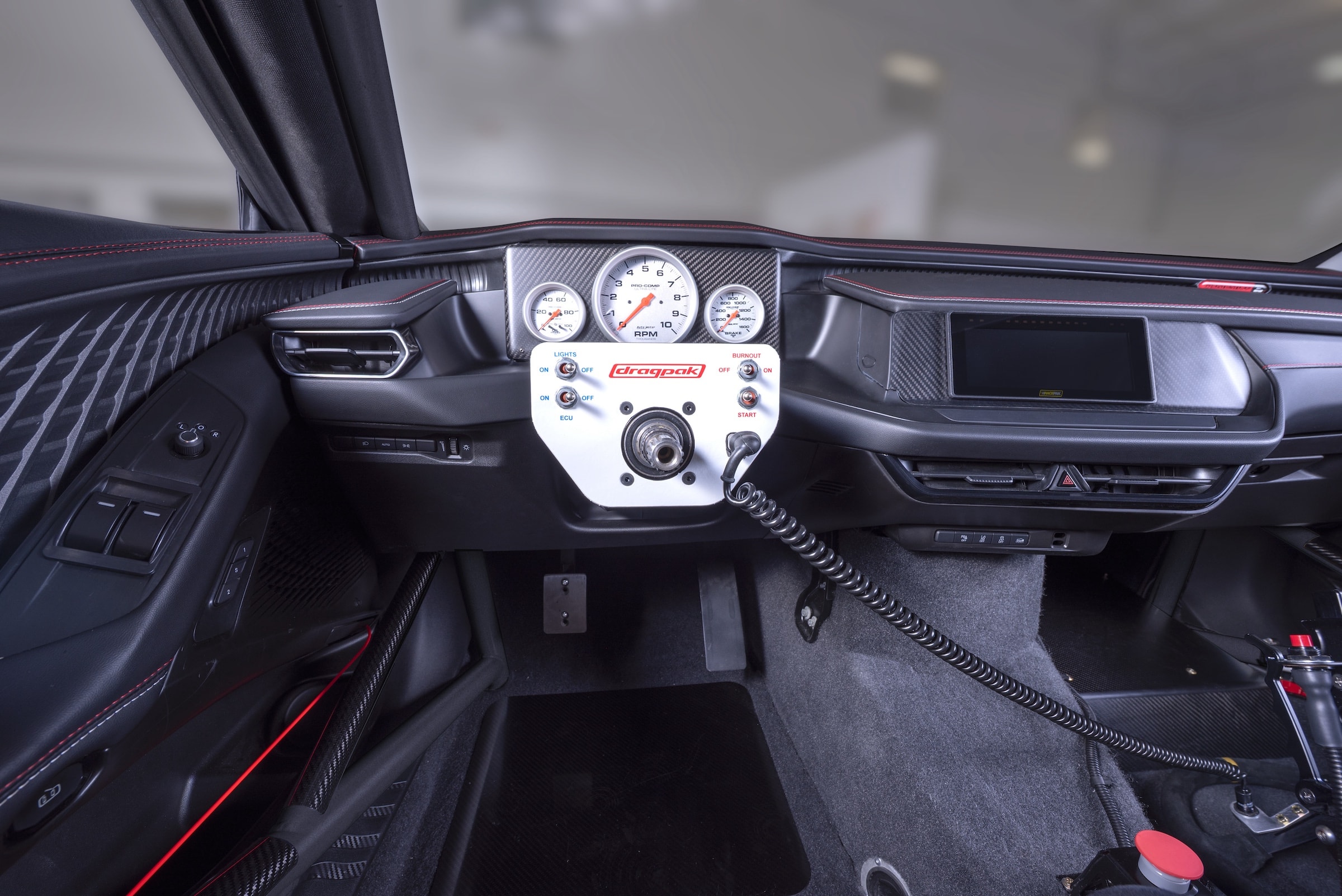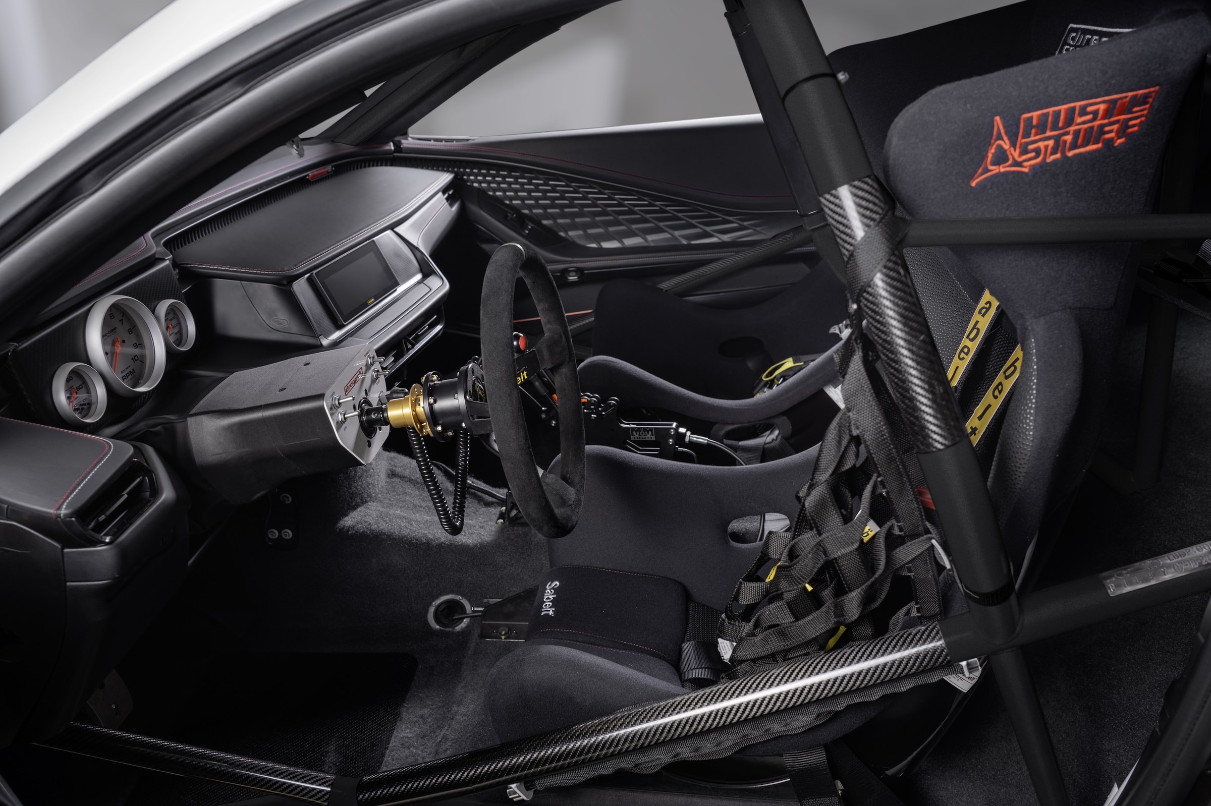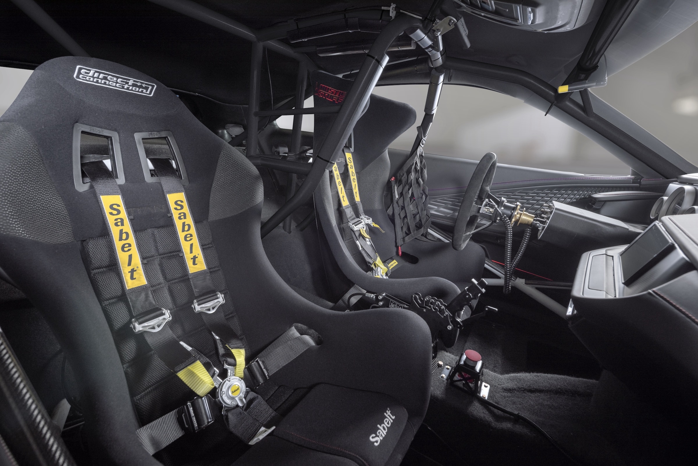 Капот, двери, крышка багажника и передняя панель углепластиковые. Это сэкономит порядка 45 кг массы по сравнению с обычным Charger. Вся подвеска новая, с койловерами и регулируемыми углами развала колес. Рулевой механизм лишен усилителя.