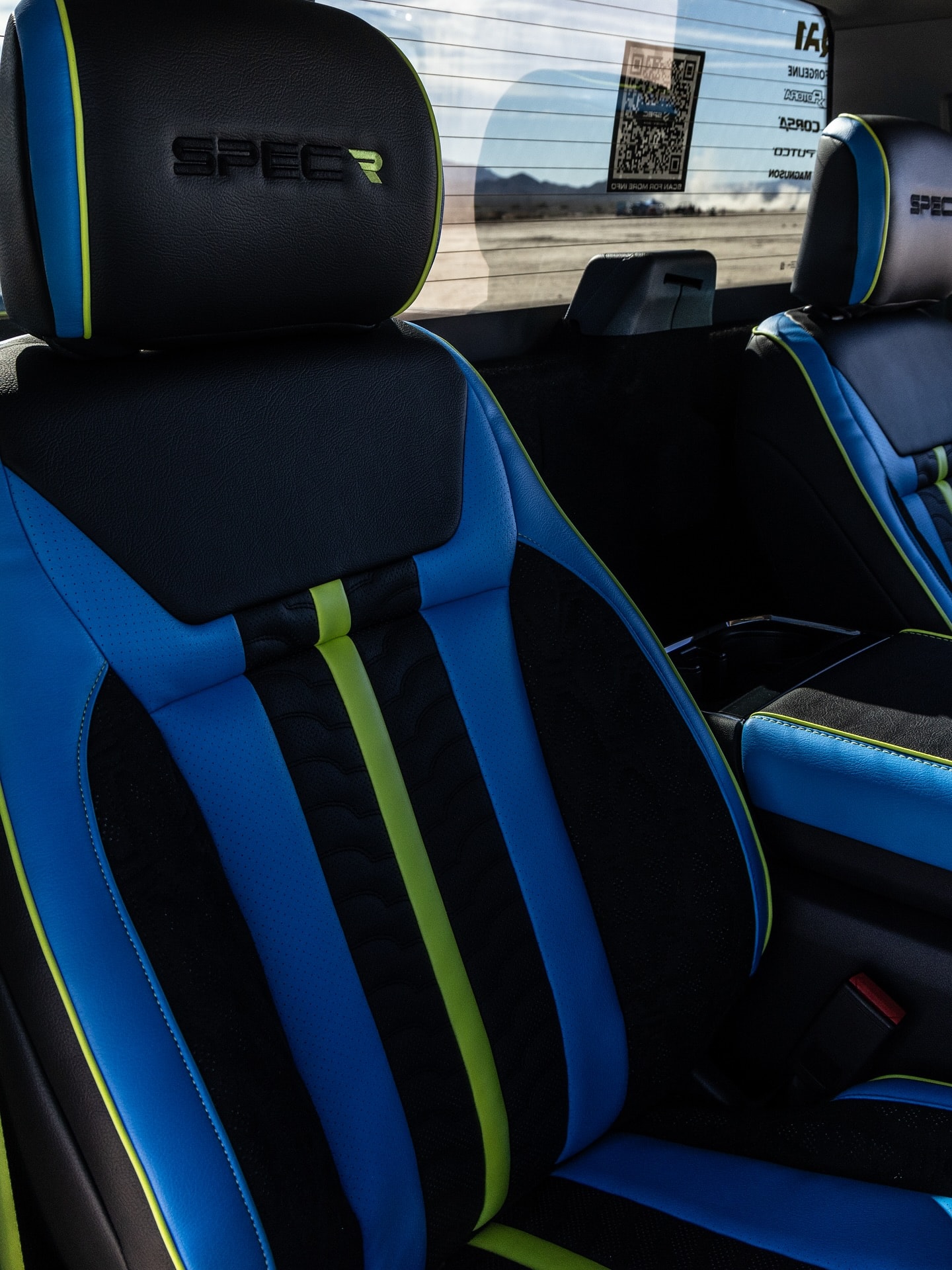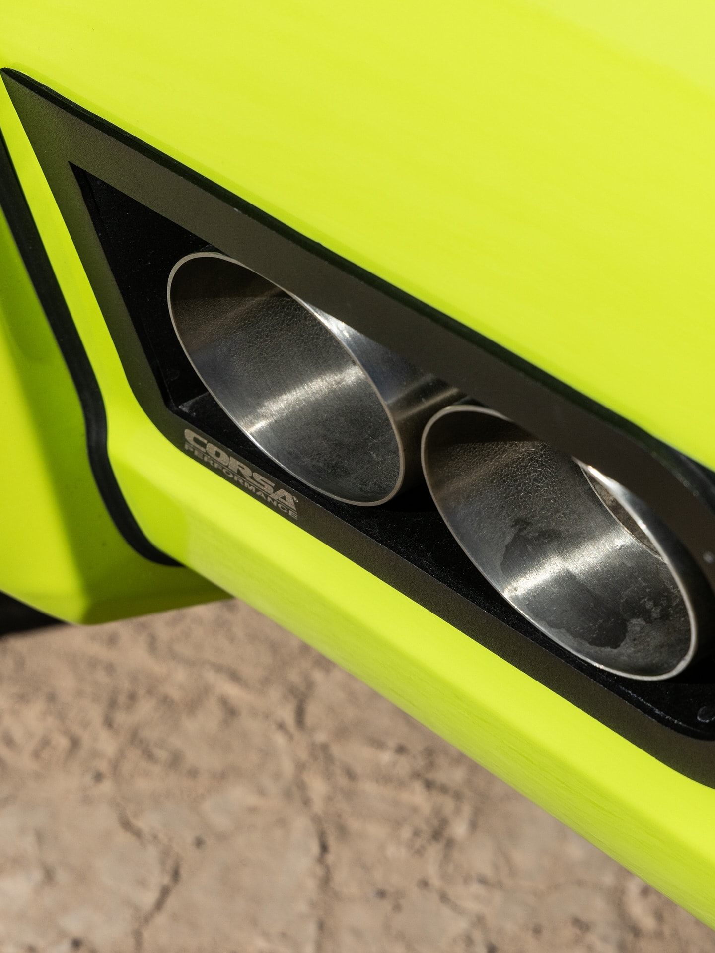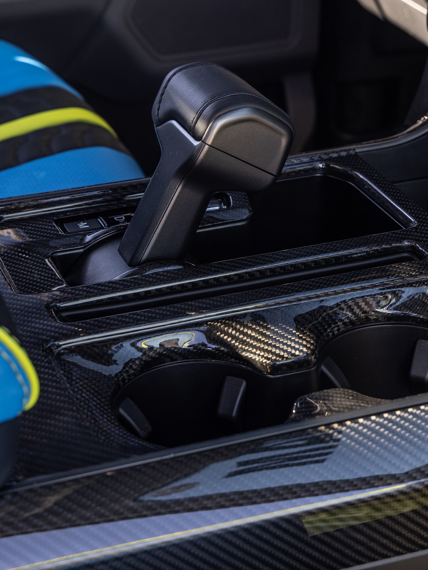 Заодно с прокачкой двигателя предлагается заказать углепластиковый обвес в агрессивном стиле от Anderson Composites. По умолчанию в наборе сочетаются детали, выкрашенные в неоновый зелёный под тон кузова, и с выставленным напоказ карбоновым рисунком, но заказчики могут выбрать и какой-либо единый вариант отделки. Добавляет спортивной эстетики подвеска от QA1 Motorsports, а эффективное торможение обеспечивается тормозными механизмами Rotora с углерод-керамическими дисками и восьмипоршневыми суппортами спереди.