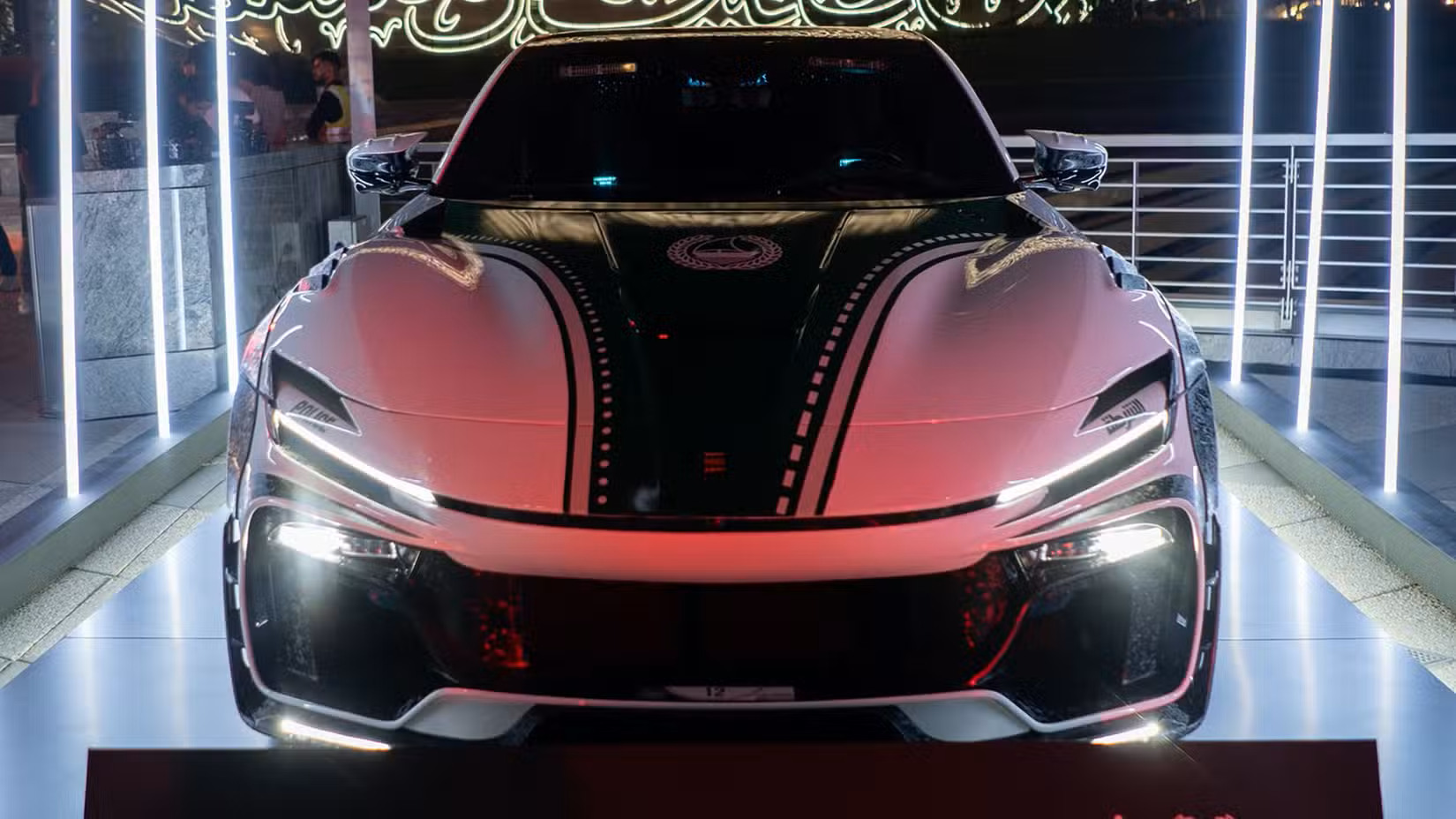 Автомобиль сразу легко опознать по развитому обвесу из углепластика с «кованым» рисунком. В состав вошли расширители арок, вентилируемый капот сложной формы, многочисленные накладки на оба бампера, а также гигантское антикрыло и соответствующий ему диффузор. Кузов выкрасили в белый и зелёный цвета, полагающиеся всем патрульным авто Дубая.