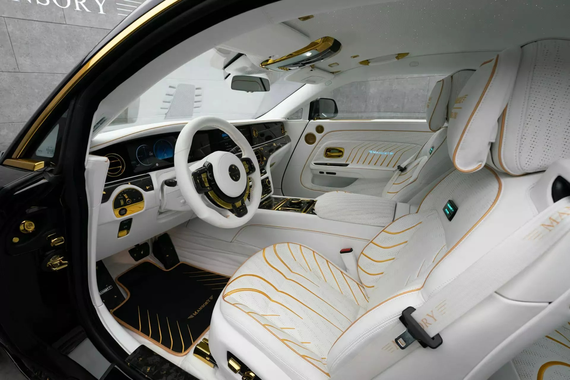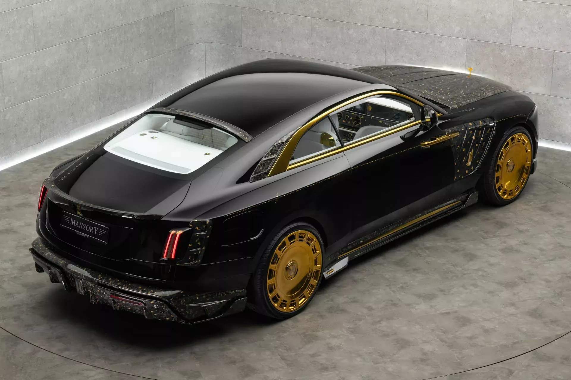 Спутать двухдверку с серийной невозможно ни с одного ракурса. Спереди она обзавелась позолоченной решёткой радиатора и такой же статуэткой «Дух экстаза» на капоте. Капот, сплиттер, накладки на боковины, а также диффузор и спойлер сзади произвели из кованого карбона, в который добавили хлопья натуральной позолоты. Ещё больше драгоценного металла ушло на оконные рамки, ручки дверей и особенно - на 24-дюймовые кованые диски.