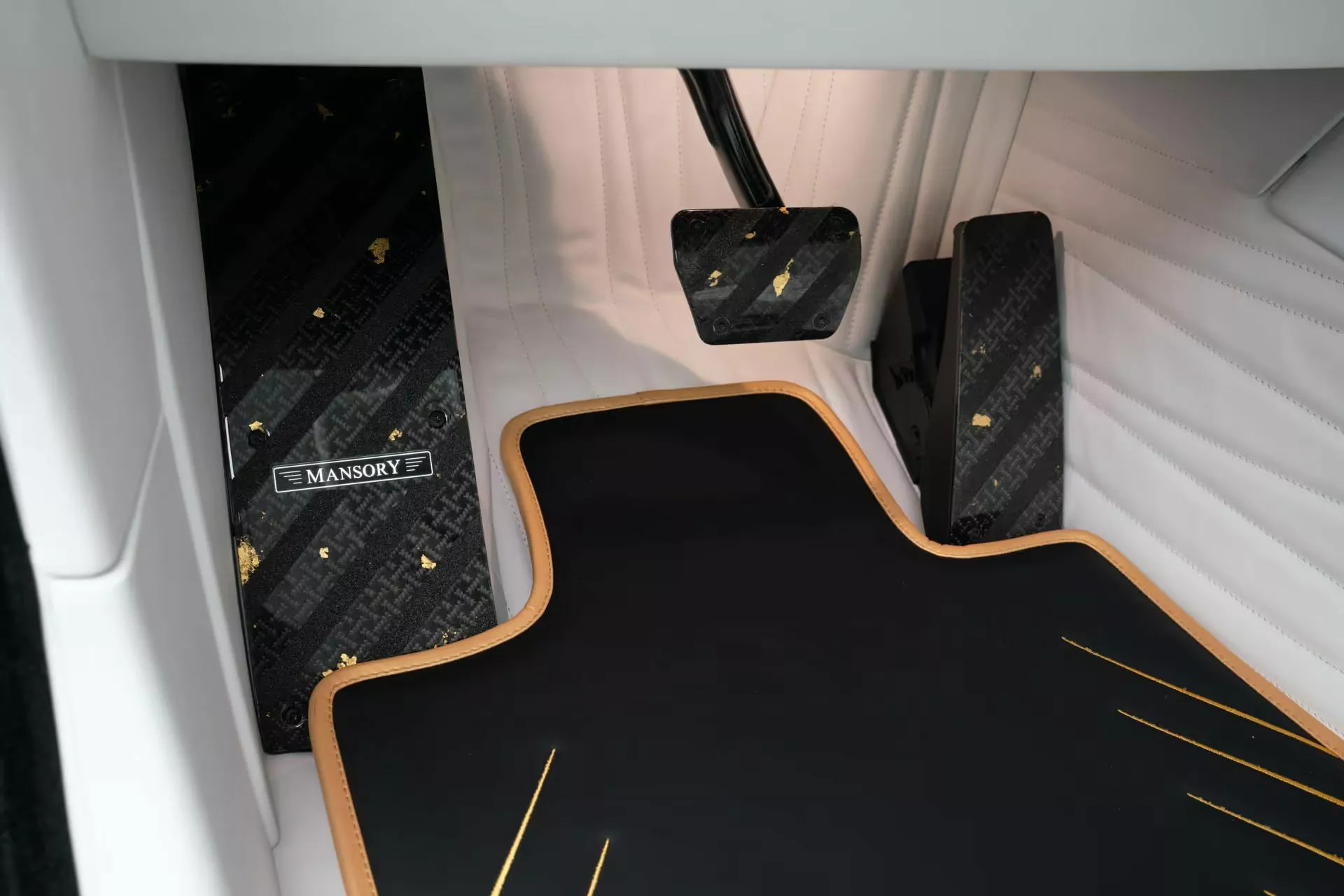 Салон оформили белоснежной кожей с перфорацией, а на роль акцентов взяли всё те же золото и карбон. В общей гамме оформили решётки сателлитов акустической системы, кнопки с переключателями и даже зонтики в дверях.