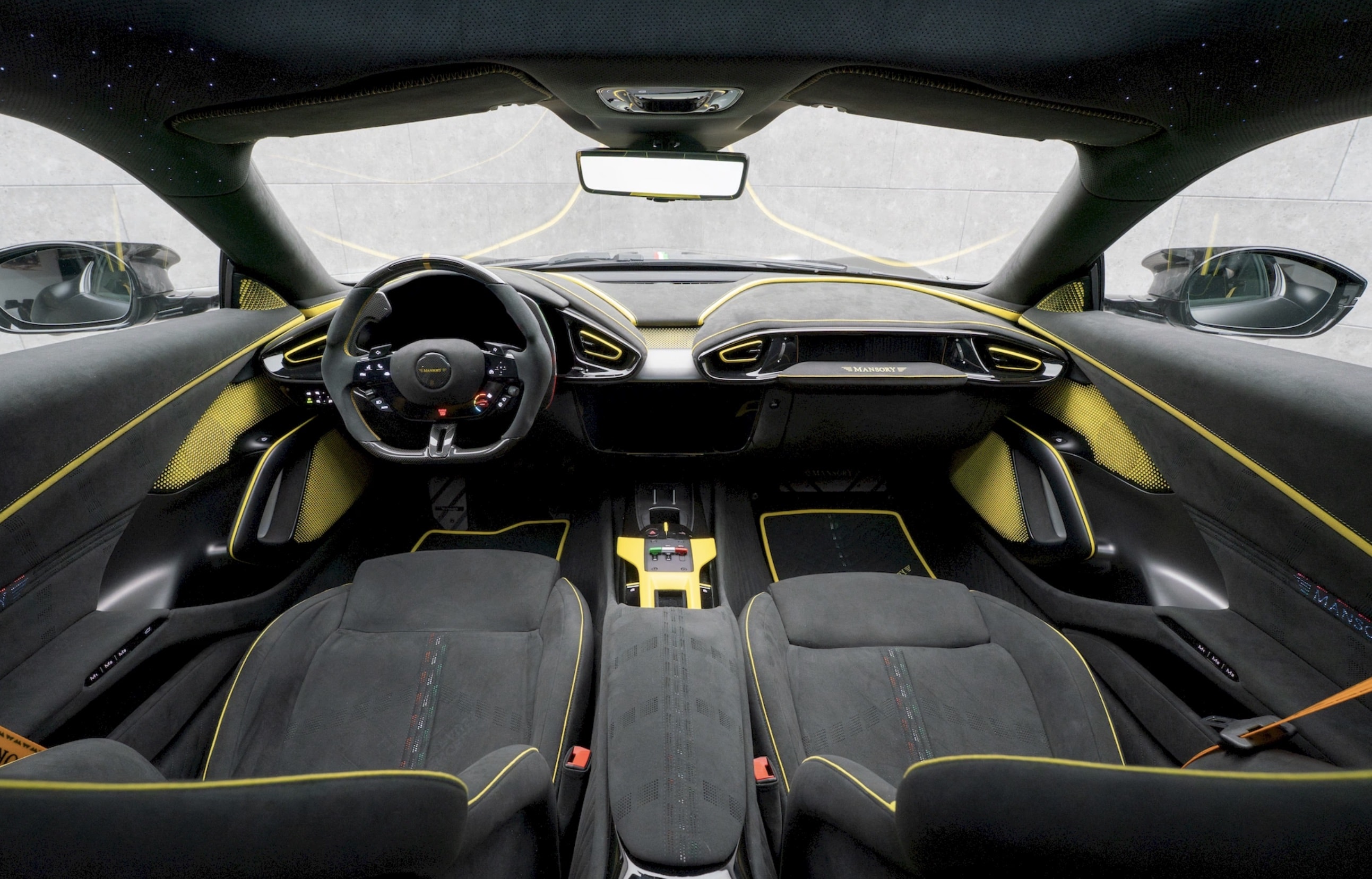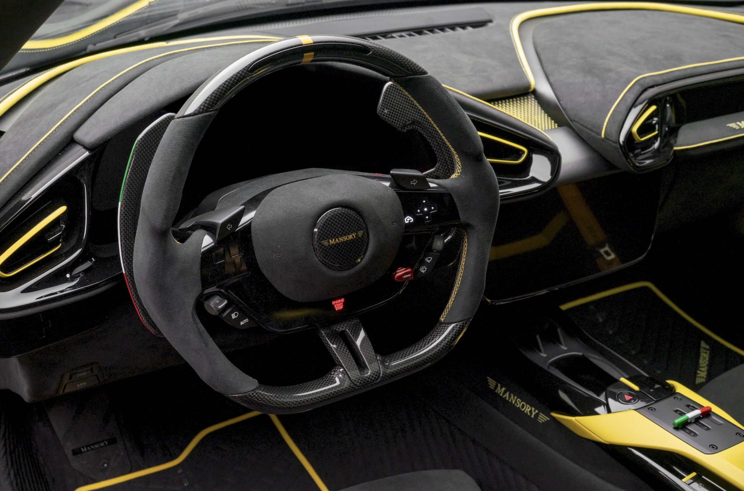 Салон декорирован в привычном для тюнера стиле с использованием высококачественной кожи, искусственной замши и всё того же карбона. Связать образ воедино помогают стратегически расставленные жёлтые акценты.