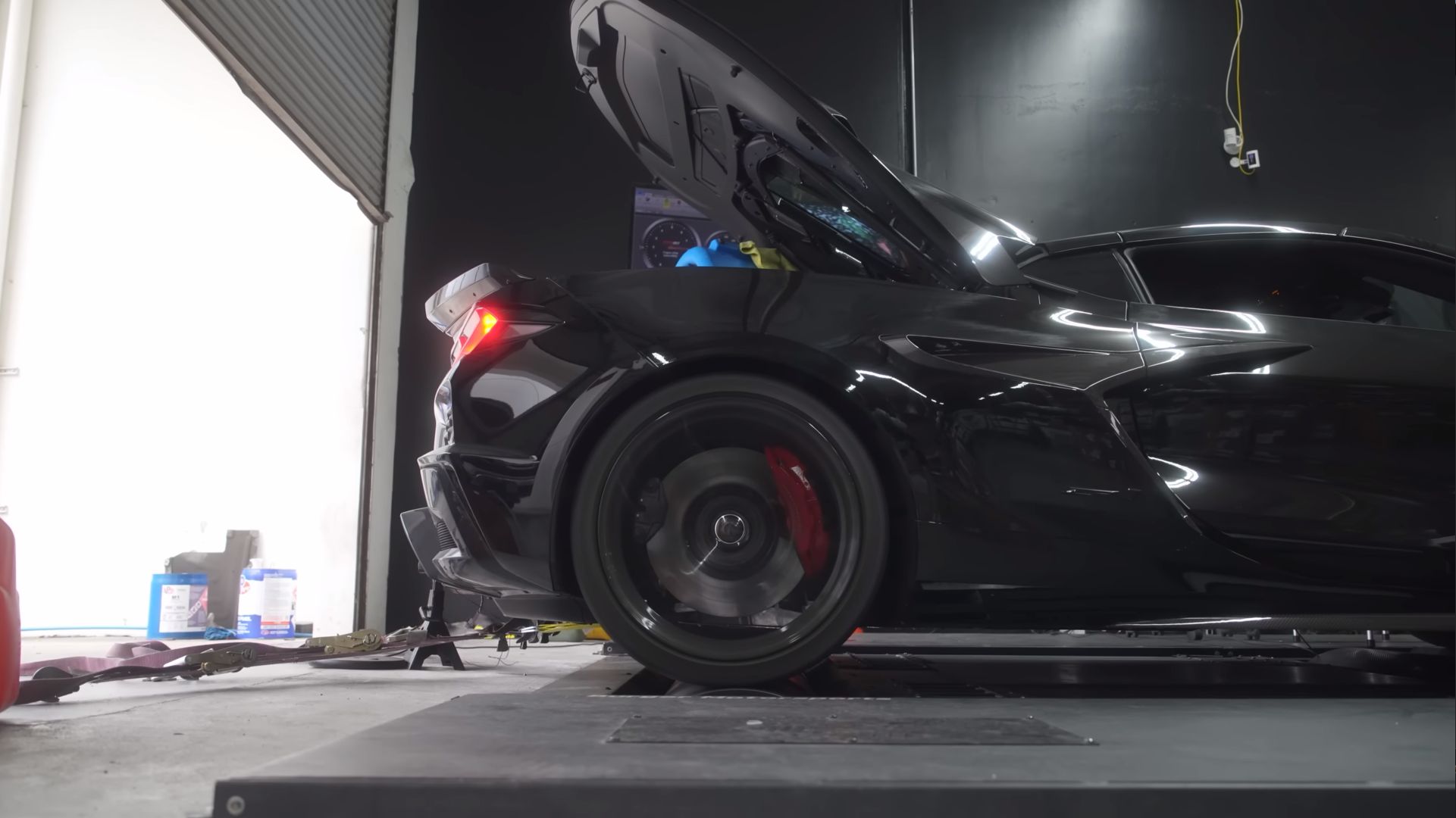 Напомним, что в заводском исполнении ZR1 комплектуется 5,5-литровой «битурбовосьмёркой». Она устанавливается в пределах колёсной базы и использует коленвал с плоским сечением вместо крестообразного. Без учёта потерь трансмиссии мощность составляет 1079 лошадиных сил, но до колёс фактически доходит 900 с небольшим.