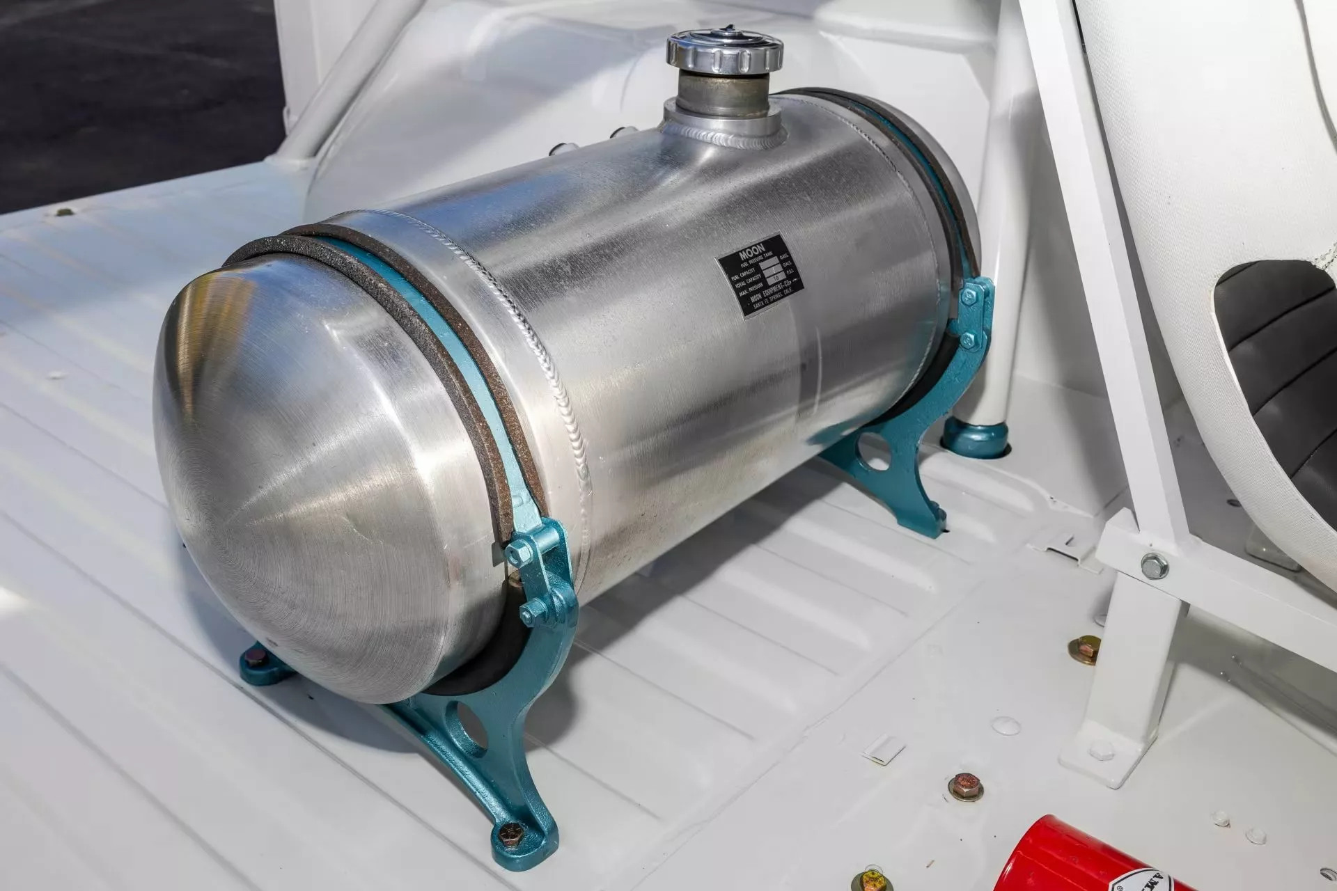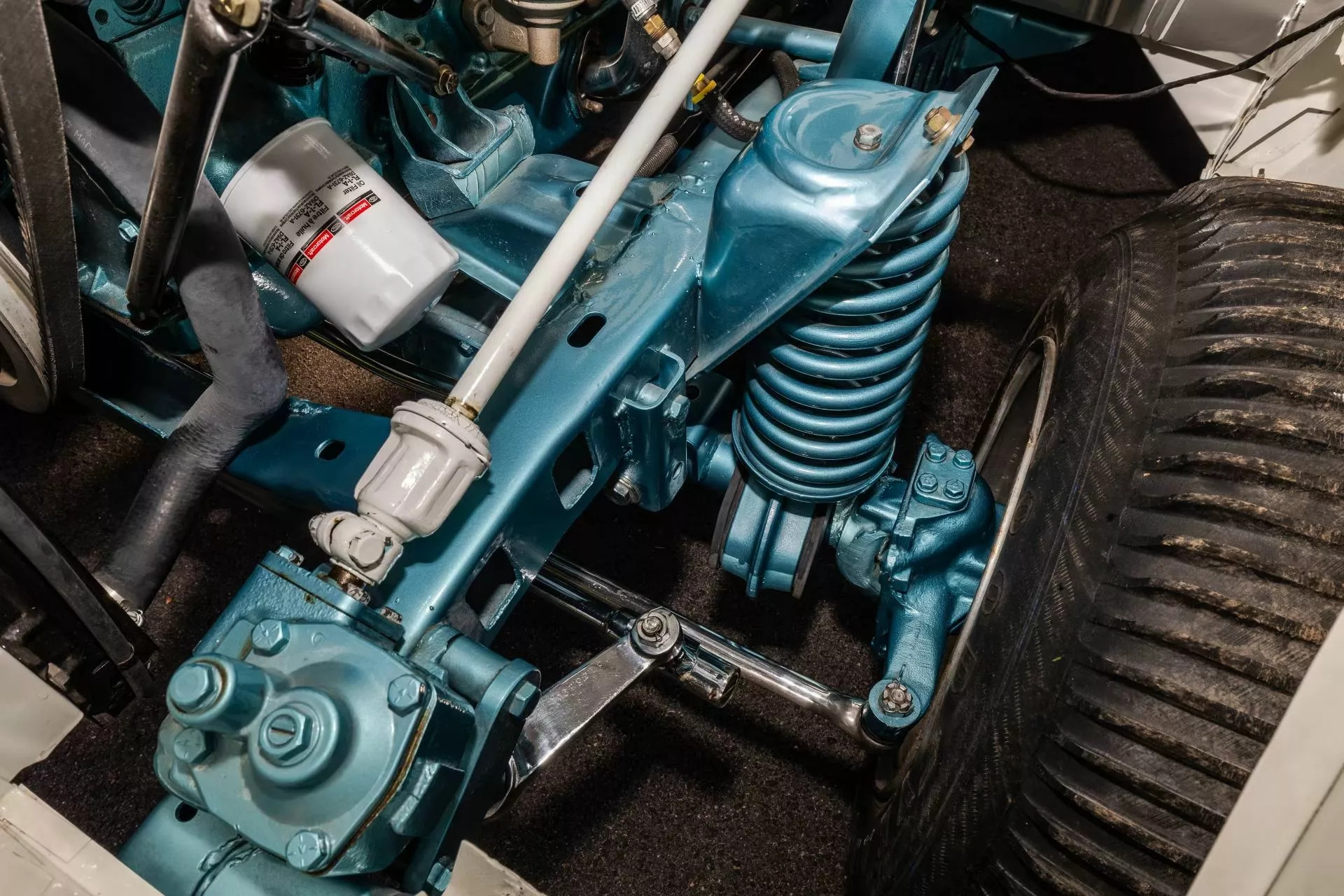 Взгляд в арки обнаруживает мощные амортизаторы подвески и 15-дюймовые диски в изготовленных на заказ шинах Goodyear: поперечные бороздки в протекторе вырезаны вручную для сцепления с песком. Тормозные механизмы есть только сзади – с передней оси их удалили для снижения веса. Использовать автомобиль рекомендуется только по прямому назначению – для дрэговых заездов по пустыне – и только в закрытом шлеме, чтобы песок не попадал в лицо.