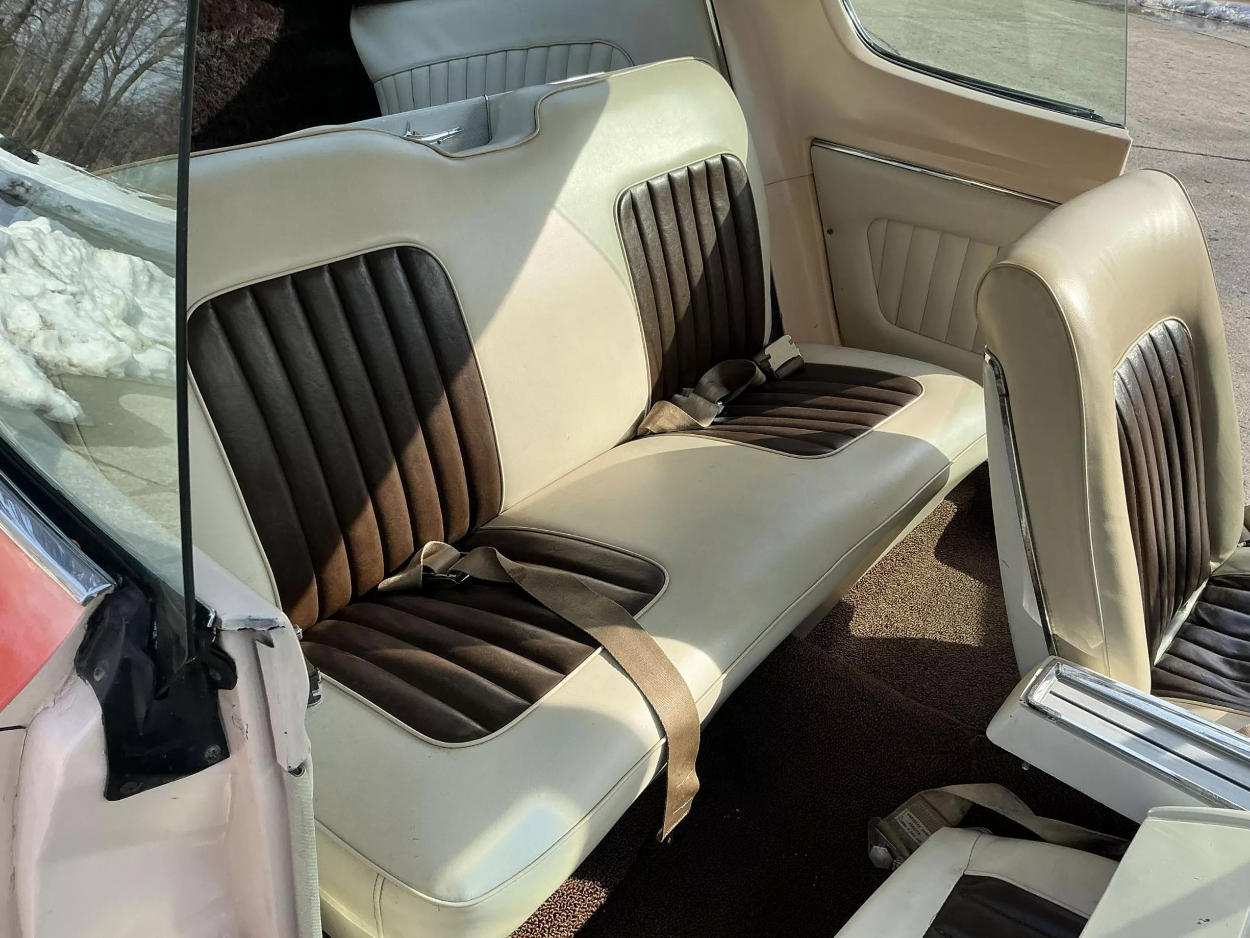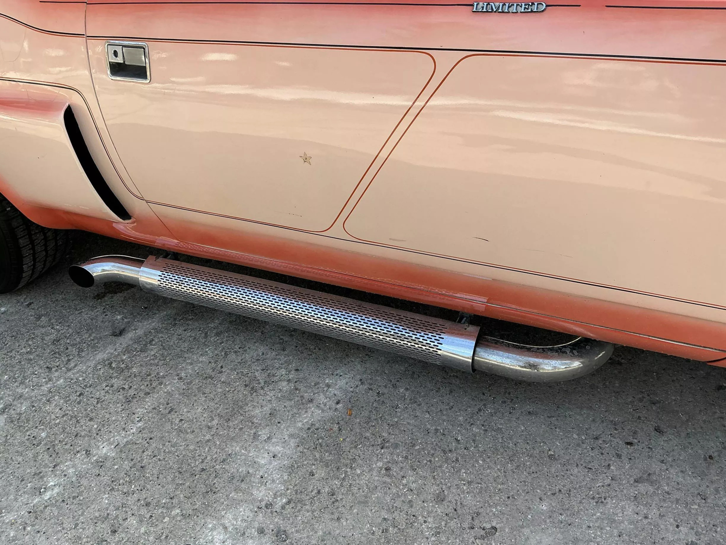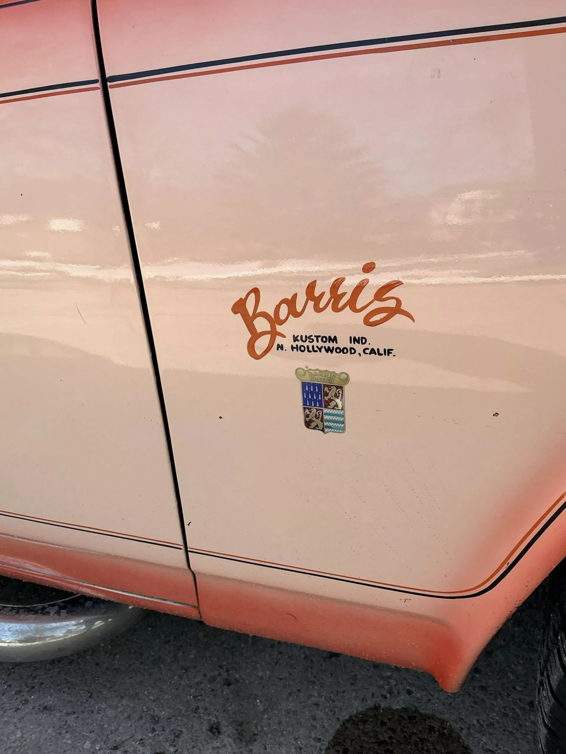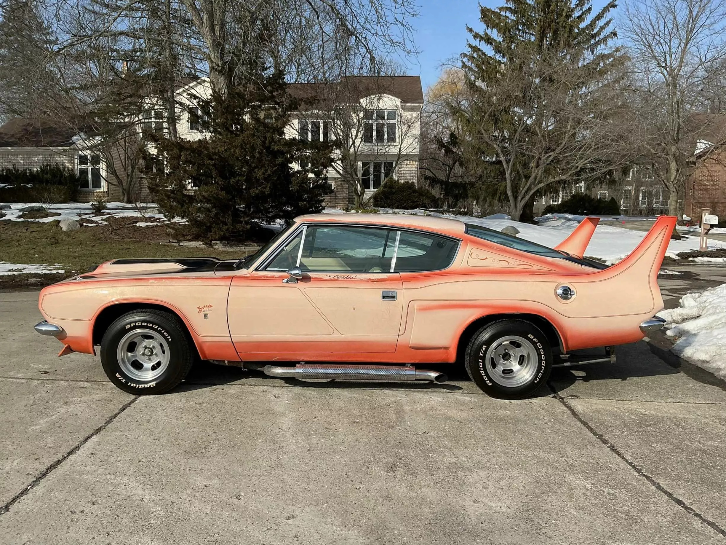 В исходном виде двухдверка щеголяла серебристой ливреей, но в мастерской Барриса её переосмыслили в персиковых тонах. Кузову достались дополнительные воздухозаборники, гигантское антикрыло и выведенные вбок патрубки выхлопной системы. В арках разместились модные в 70-х «катки» из магниевого сплава с прорезями, бока украсили спортивными полосками, а за передним левым крылом разместился логотип создателя.