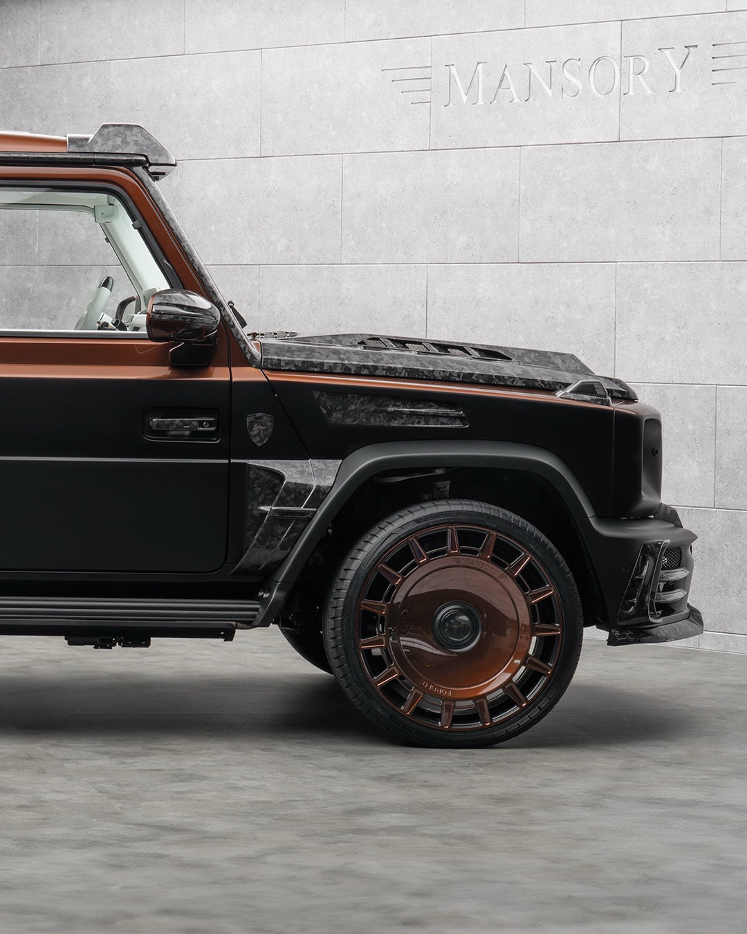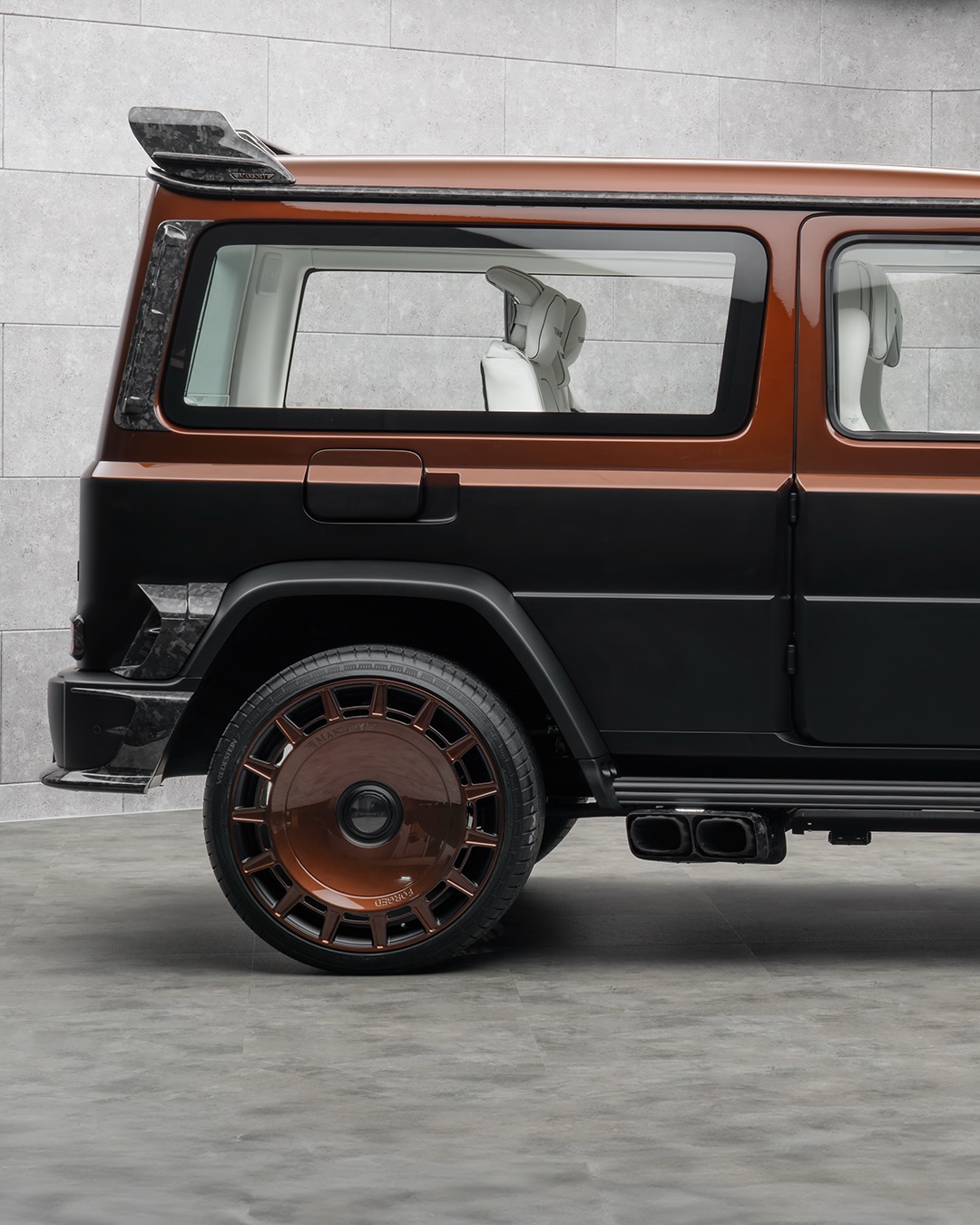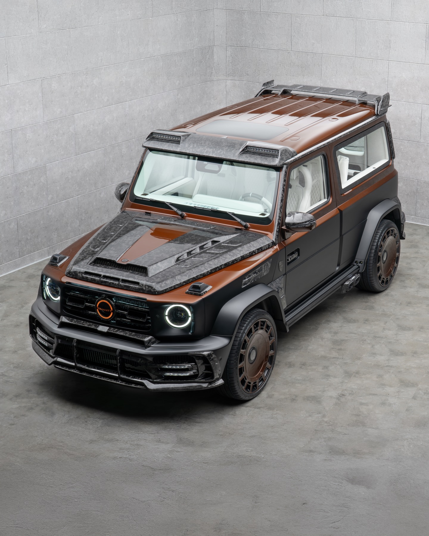 Взамен «проходимец» обзавёлся уникальной внешностью на базе обвеса из углепластика с «кованым» рисунком. В составе – передний бампер с воздухозаборниками, рассекатель воздуха, радиаторная решётка, рельефный капот, арки, крышной спойлер и диффузор. «Катки» раллийного типа удачно гармонируют с матовой чёрно-коричневой гаммой экстерьера, хотя их собственная отделка глянцевая.