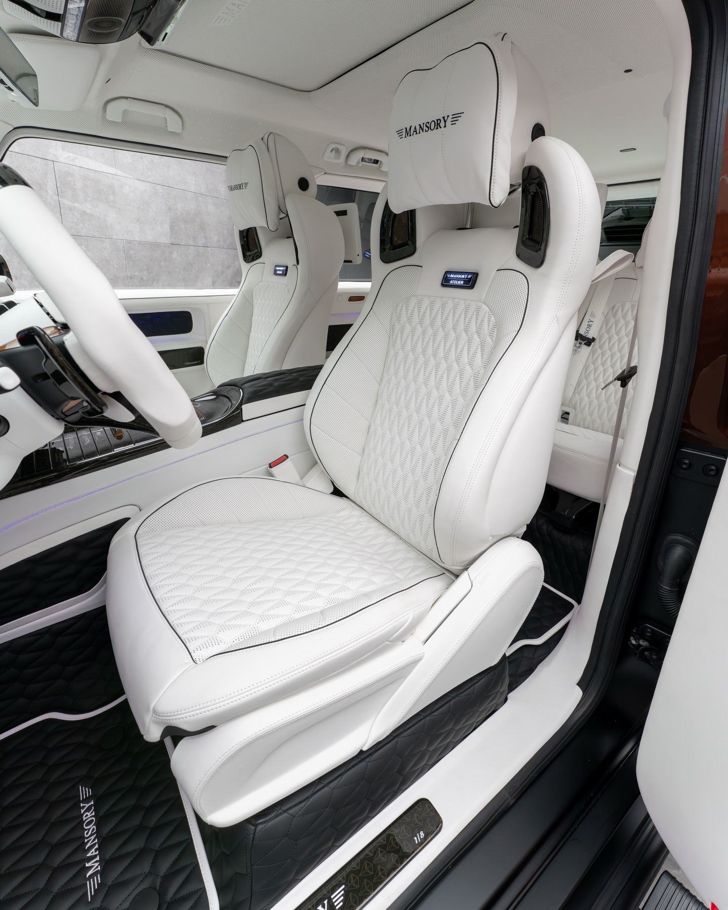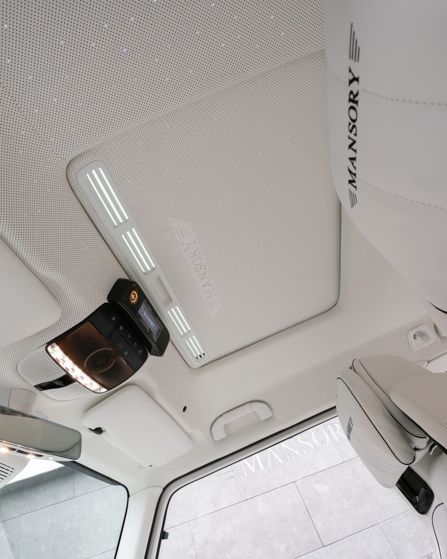 Интерьер заново перешит белоснежной кожей с контрастными декоративными элементами и карбоновыми вставками. Логотипы ателье расположены повсюду, начиная от ковриков и порогов и заканчивая потолком.