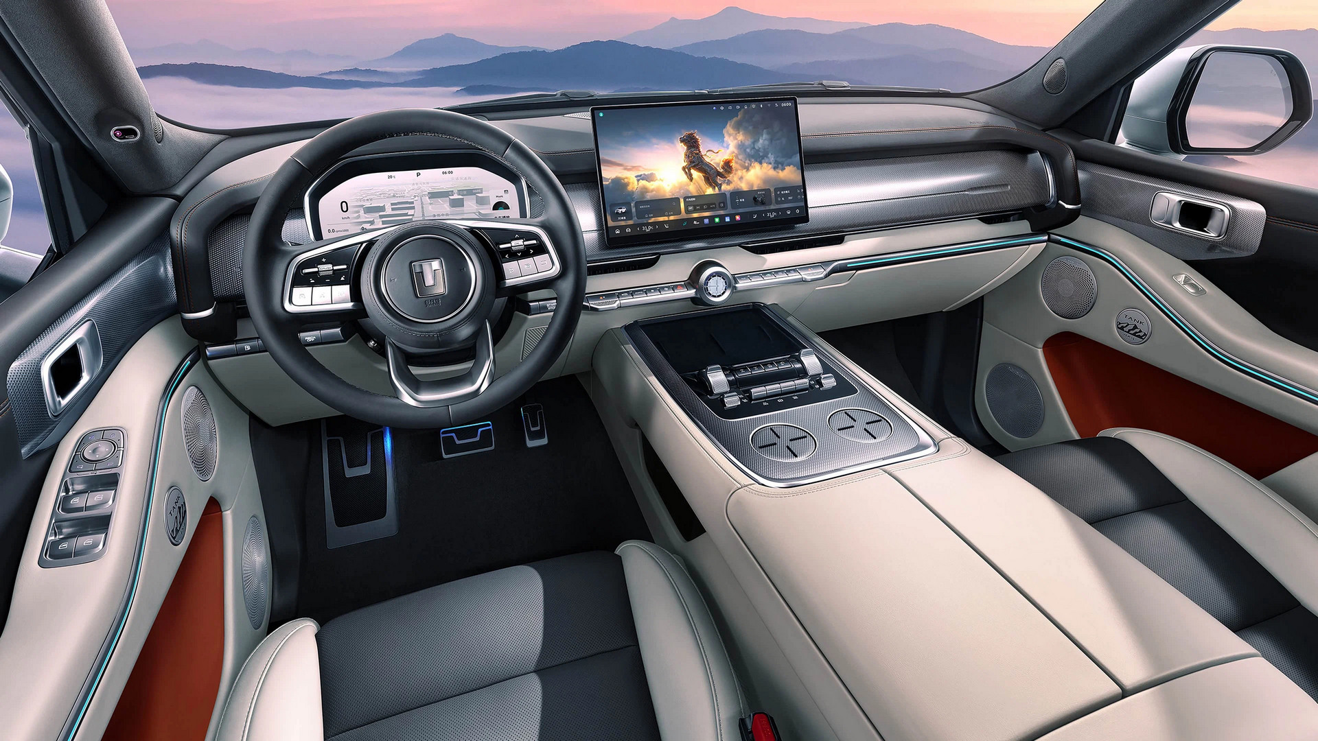 Салонным убранством модель 700 Hi4-Z мало чем отличается от уже продающейся версии Hi4-T (см. видео). У неё трёхспицевый руль, цифровая приборка, минимум физических кнопок и будто бы состоящая из нескольких частей передняя панель. В то же время изменился центральный тоннель: с него исчез переключатель трансмиссии, но у подстаканников появились практичные крышки. В плане опций компания обещает, помимо прочего, двуцветную кожаную отделку, дисплей с креплением на потолок для заднего ряда и теневые шторки.