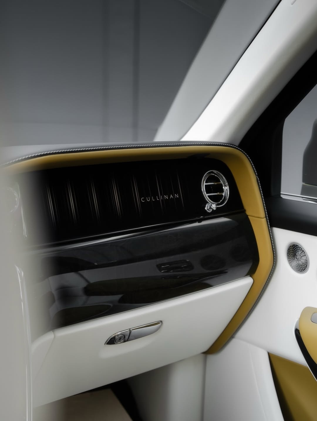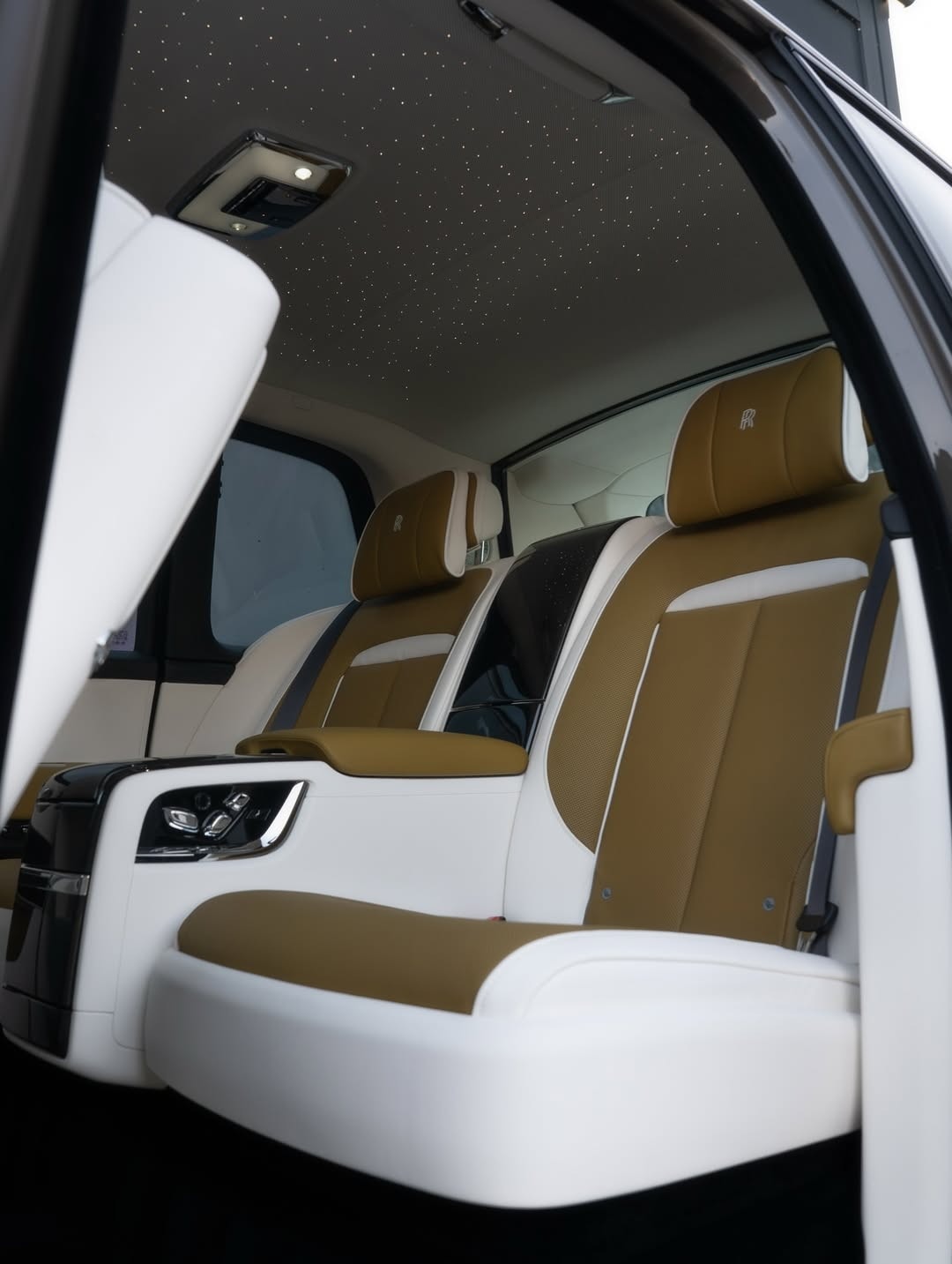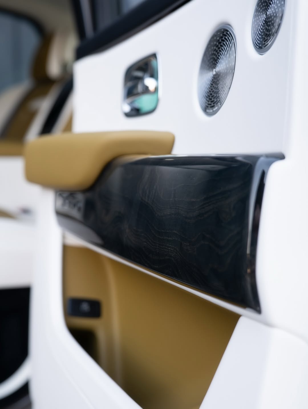 В салоне, судя по логотипам RR на подголовниках кресел и отсутствию значков Spofec, сохранилась штатная обивка натуральной кожей в горчично-жёлтом и белом цветах. На роль акцентов выбрали глянцевые чёрные и металлические вставки. Впрочем, нельзя исключать, что клиент пожелал сохранить оригинальное брендирование при перетяжке интерьера; такой вариант в каталоге ателье тоже числится.