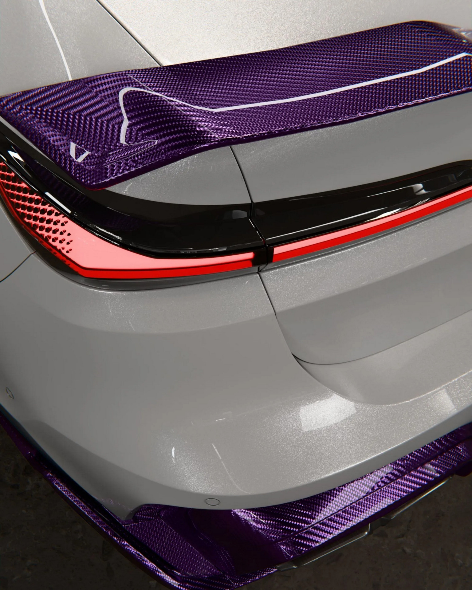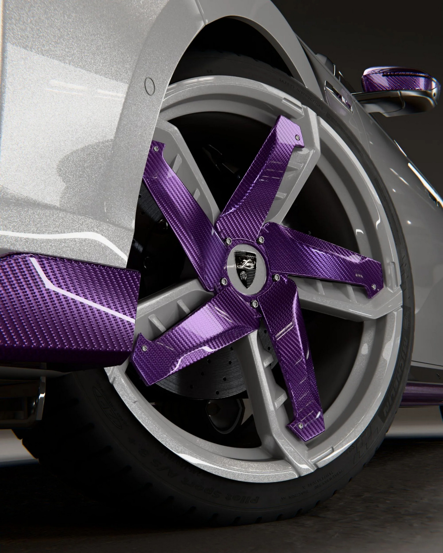 Все детали произведены из углепластика с добавлением препрега для прочности и специального сиреневого колера. Примешивая краску прямо в пластик при формовке, тюнеры придают ему нужный цвет без необходимости окрашивания поверхности готовой детали – так достигается насыщенный оттенок при сохранении характерного рисунка углеродных волокон.