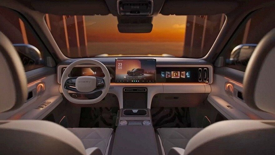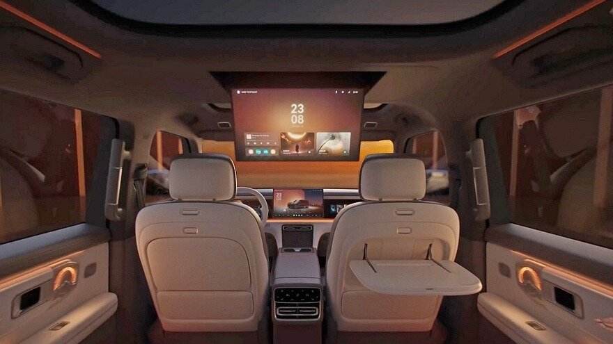 В минималистичном интерьере на передней панели располагается трио дисплеев, протянувшееся почти во всю её ширину, а седокам сзади выделен отдельный экран с креплением на потолок. Задний ряд представлен двумя отдельными креслами и снабжён откидными столиками.